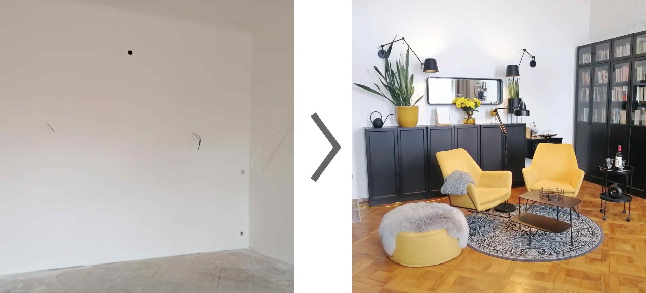 Základní úvahou rekonstrukce tohoto bytu bylo dostat byt do původního dispozičního stavu - vrátit zpět průchozí pokoje a odstranit spojovací chodbu, kterou zde vybudovali předešlí nájemníci. Podlaha i dveře zůstaly stávající - parkety prošly renovací a ponechaná stará skříň se ošetřila a přeskládala dle potřeb klienta. Zakomponovala jsem prvky jako starý paravan nebo malířský stojan. Klientka ráda maluje a čte, bylo tedy třeba myslet na prostor pro knihy a obrazy na stěnách. Byt má vysoké stropy, které jsem využila pro opravdu velké a výrazné osvětlení. Celý byt slouží pouze jedné osobě, a tak byla možnost se trochu prostorově rozmazlovat.