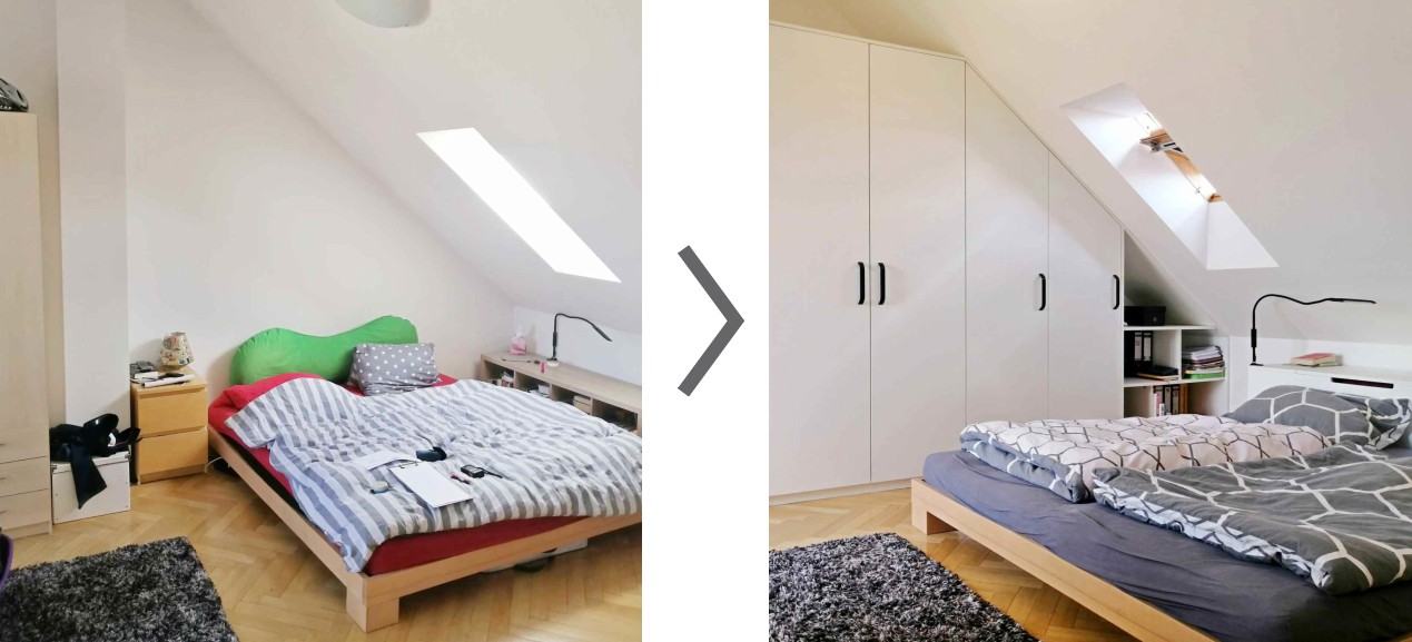 V tomto projektu šlo především o vhodný návrh uspořádání nábytku. V horním patře mezonetového bytu se nacházely 2 pokoje - ložnice a téměř nevyužívaný pokoj s pracovním koutem. Oba pokoje byly vybaveny spíše provizorně a majitelé bytu se rozhodli investovat do jejich proměny. Zadáním bylo upravit ložnici rodičů a sousední pokoj připravit na příchod očekávaného potomka. V ložnici jsem navrhla novou pozici postele, čímž se zlepšila využitelnost pokoje pod zkosenou střechou (více úložného prostoru) a zároveň se otevřel výhled z postele na terasu a panorama Prahy. Do ložnice jsem také začlenila nový menší pracovní stůl, který své původní místo ve vedlejším pokoji přenechal dětské postýlce. Tato místnost slouží nyní jako pokoj pro hosty/dětský pokoj a časem se bude proměňovat podle potřeb pouze výměnou kusových prvků.